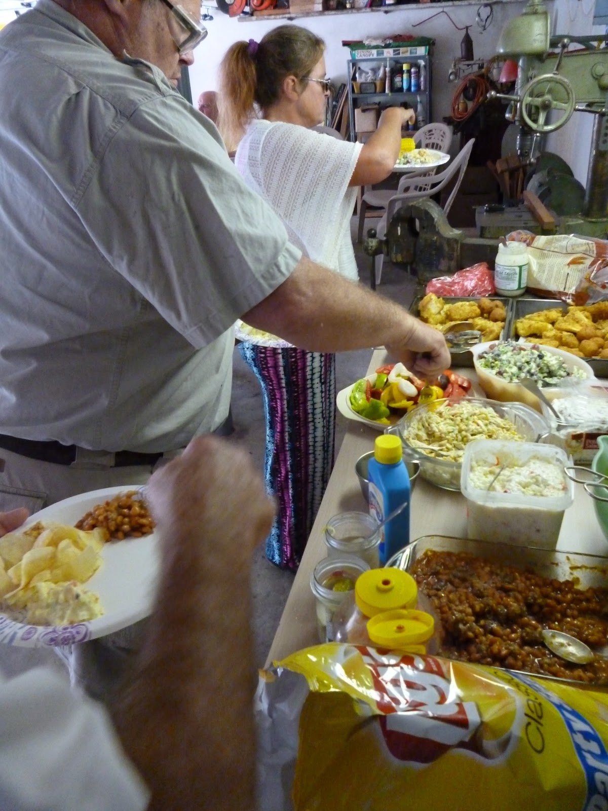 My Dad fries the fish just outside the garage. Tables are inside, and all the food is set up on the work bench. Here is my very energetic brother, he was eating standing up.