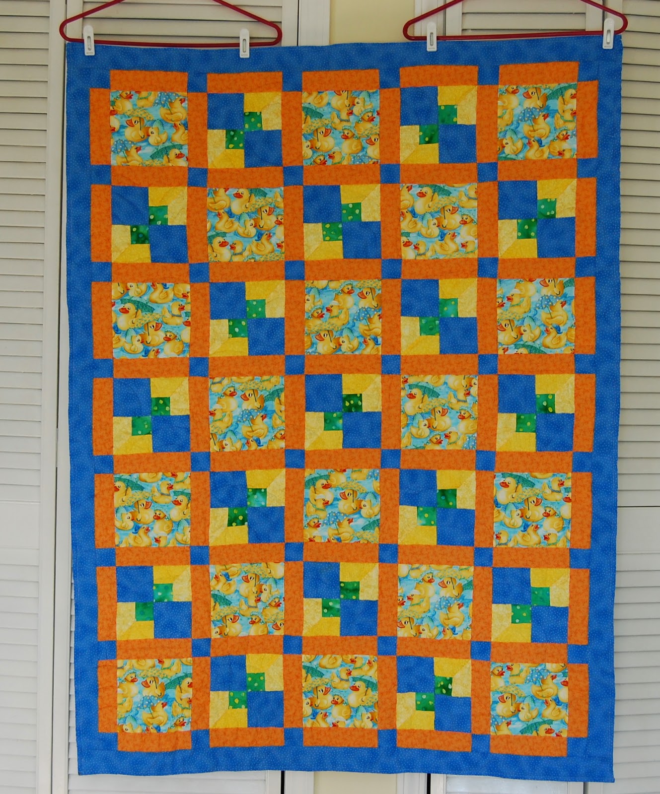 I finished up the year with this crib quilt for Allie. Again, the duck fabric was so cute I didn't want to cut it up small, so I alternated squares of duck fabrics with pieced blocks.